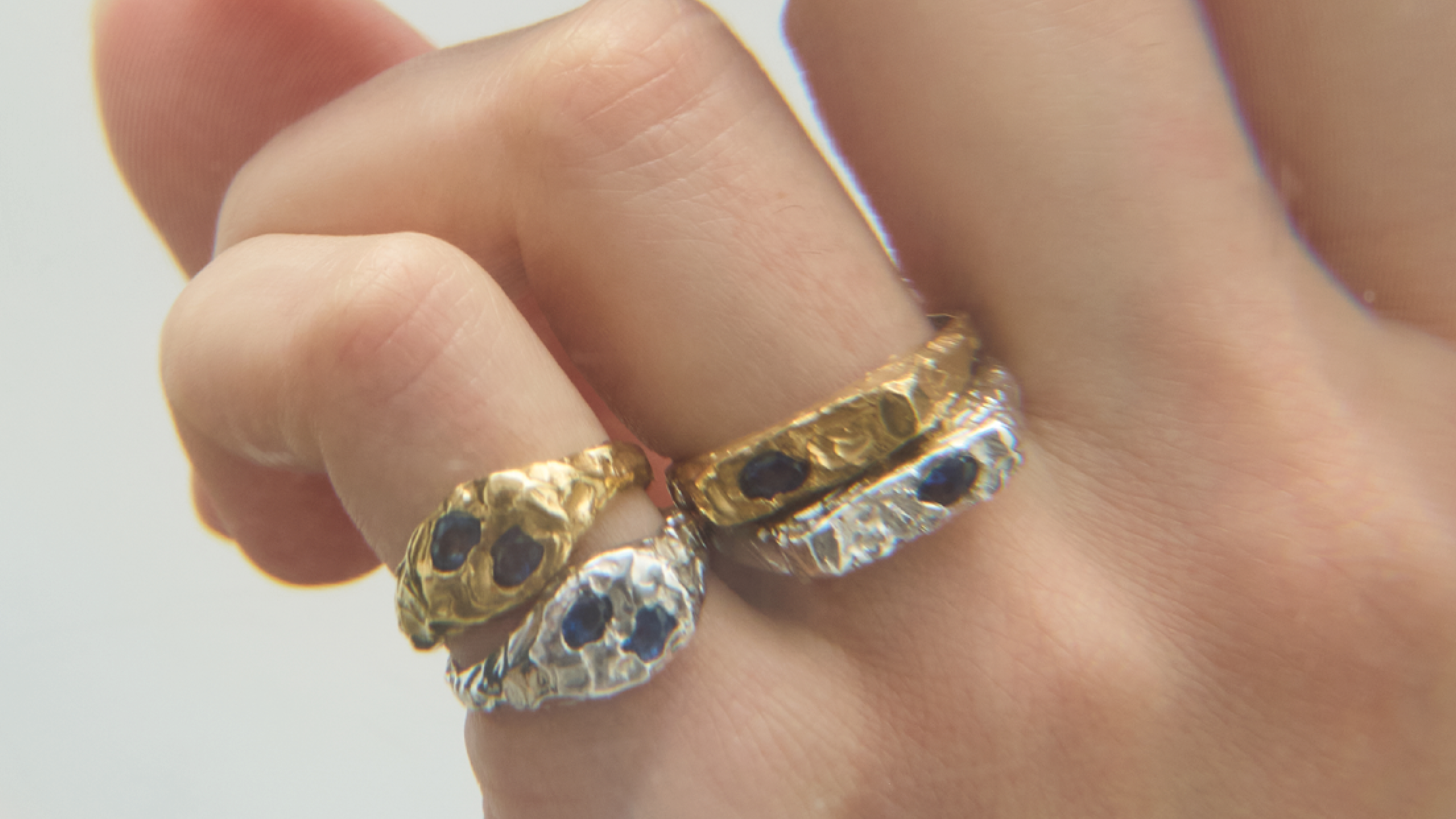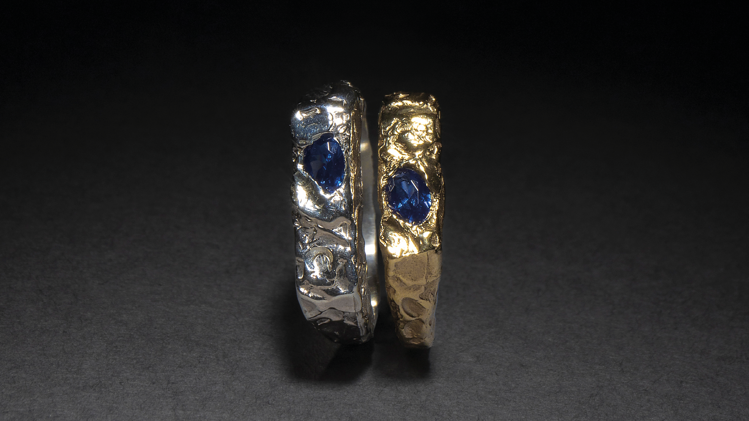 Handmade chevalier ring in hammered silver or gold, file finishing, lava texture and blue sapphire.
